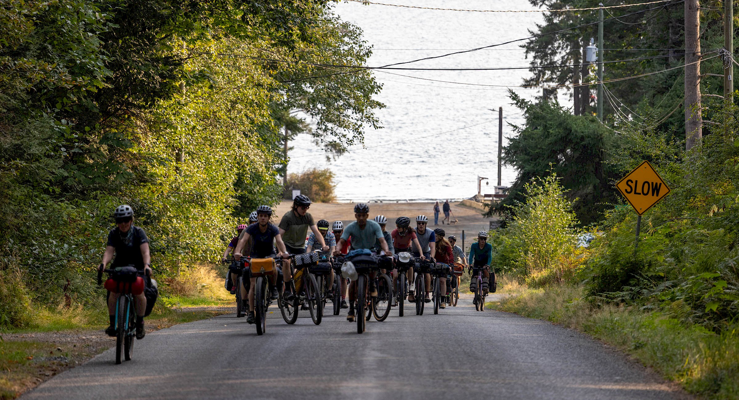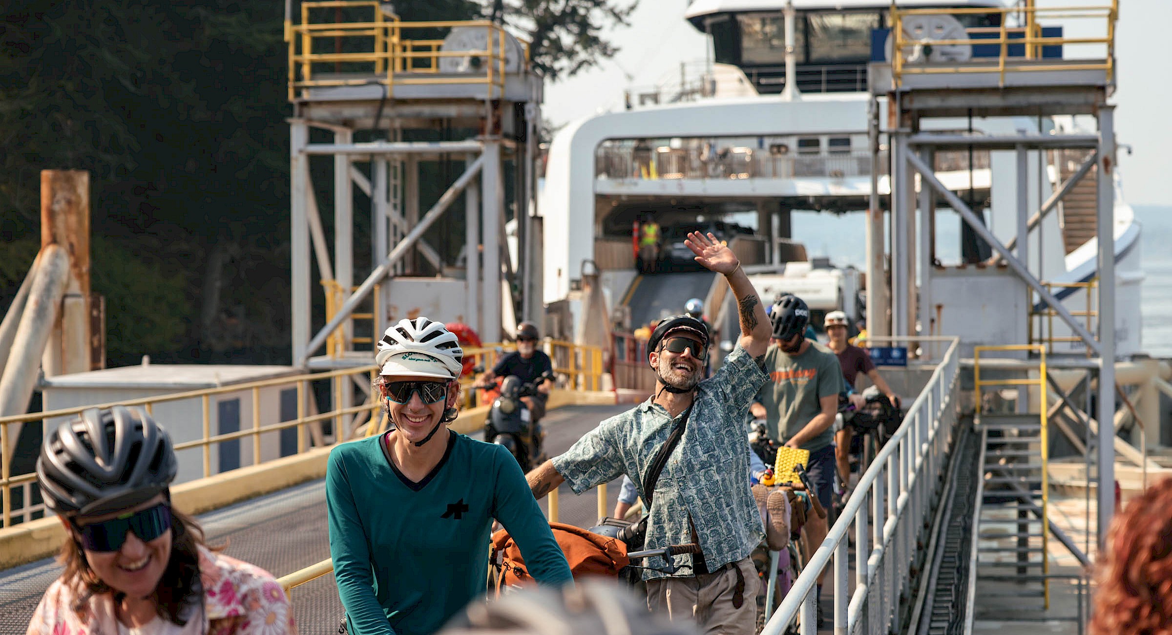 When planning this year’s event, we knew we wanted to switch up our location and route. We toyed with the idea of heading into the backcountry in qathet, and though we may still do that one day, we decided that keeping a group closer to centers is a safer bet when travelling with 40+ folks. We also remembered that during our event last year, the ferry was one of the easiest times for people to slow down, enjoy the view, and be together. Our Island Hopping Route was born, taking our group on a clockwise route from qathet, over to Comox, up to Campbell River, across to Quadra Island, to Cortes Island, and finishing the loop with a water taxi back to Lund and down highway 101 to Powell River. In an effort to continue learning, listening, and connecting with the land we’re riding on, 25% of attendee fees were donated back to local advocacy and conservation groups (We Wai Kai Guardians, Friends of Cortes Island, and Bike Lund) again for 2025.