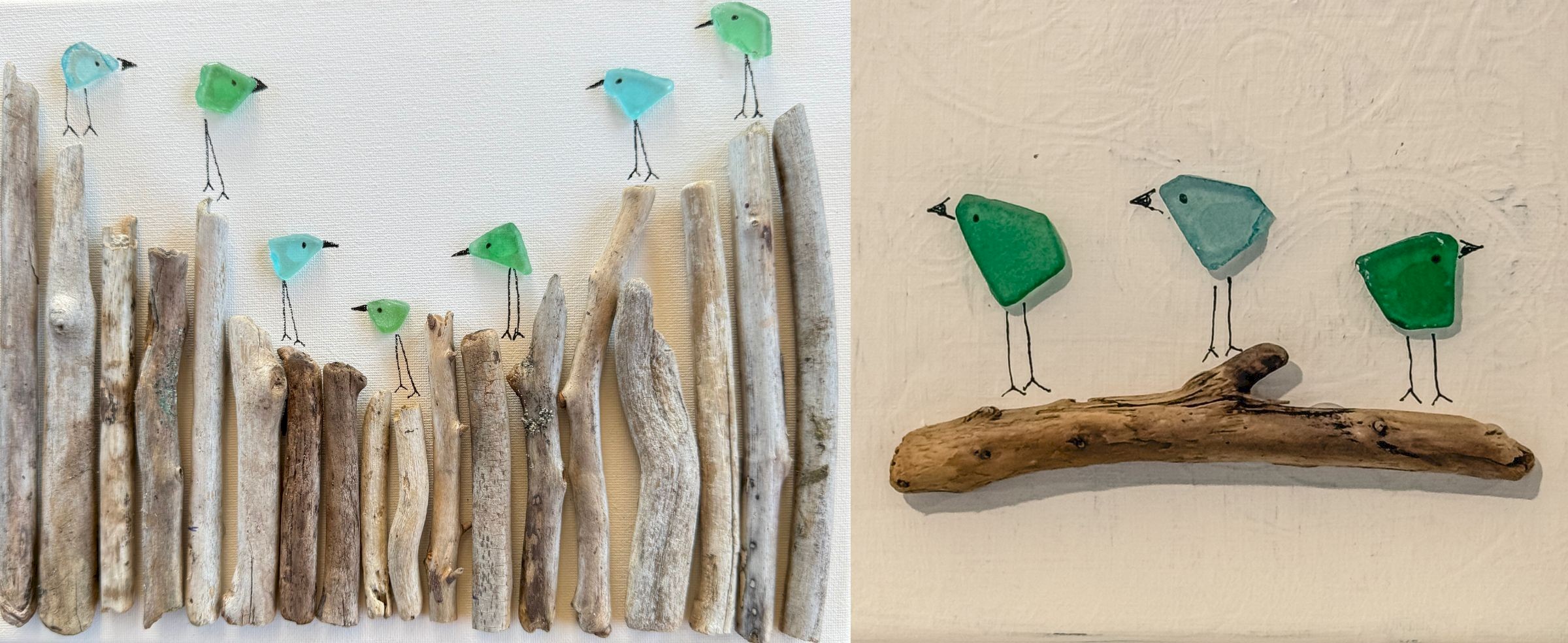 Capture the beauty of the seaside in this hands-on workshop where art meets the ocean’s treasures. Using driftwood collected from local shores and coloured glass, you’ll design your own serene coastal scene — charming birds perched on driftwood pilings against a soft canvas backdrop.