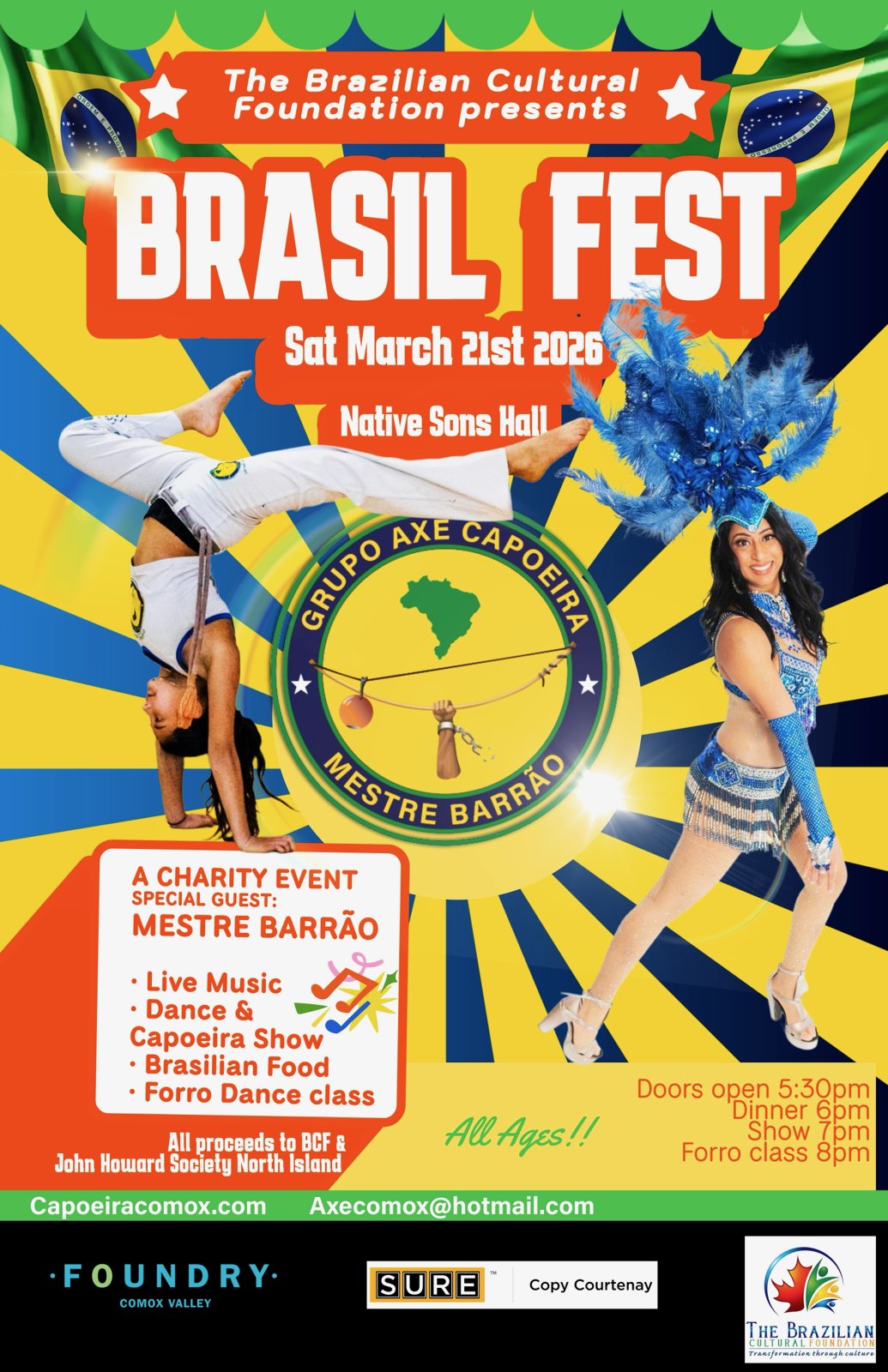 Axé Capoeira Comox Valley in partnership with The Brazilian Cultural Foundation invite the community to join them at Brasil Fest on the evening of Saturday, March 21, 2026 at the Native Sons Hall. This event will be a celebration of Brazilian culture featuring vibrant music, performances and cuisine.