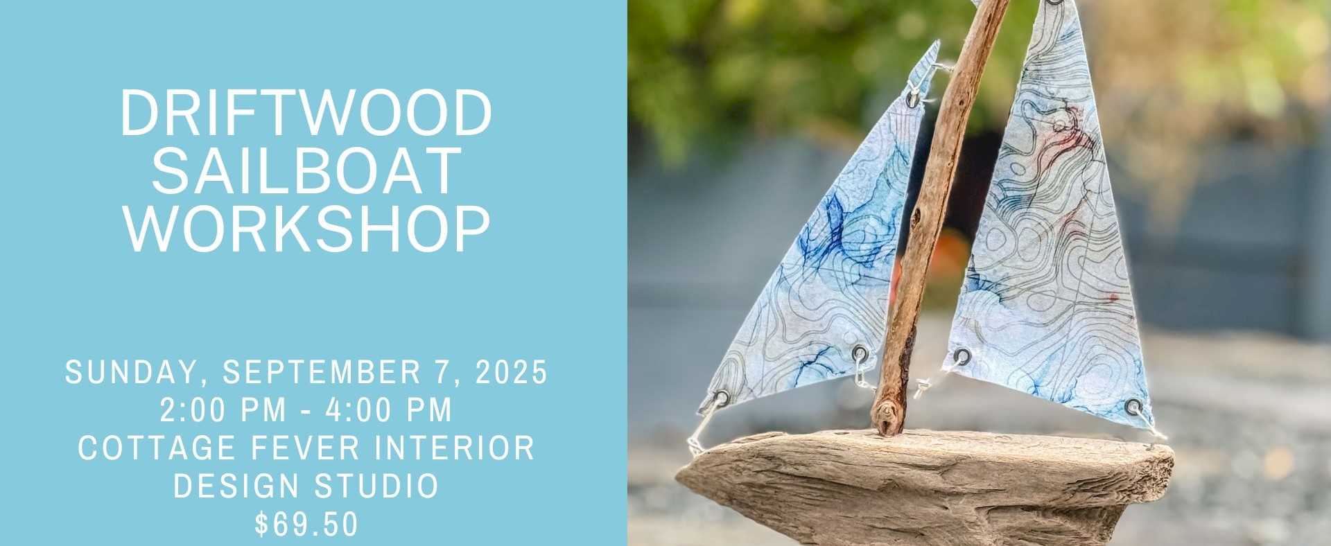 What you’ll receive: All materials including driftwood base, selection of fabrics for sails, etc…as well as one on one instruction on how to craft your sailboat. Refreshments will be provided