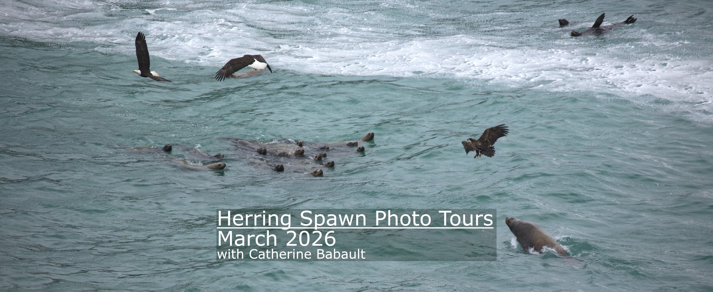 At the end of winter, large schools of herring gather to spawn in shallow waters on the coast of Vancouver Island. This spectacular annual event attracts a lot of wildlife such as sea lions, seals, bald eagles, minks, river otters, and orcas. Join local professional photographer Catherine Babault who knows the right places to capture this amazing phenomenon and hone your photo skills in the field. Tours are given on land only so we have plenty of room for ourselves and our tripods.