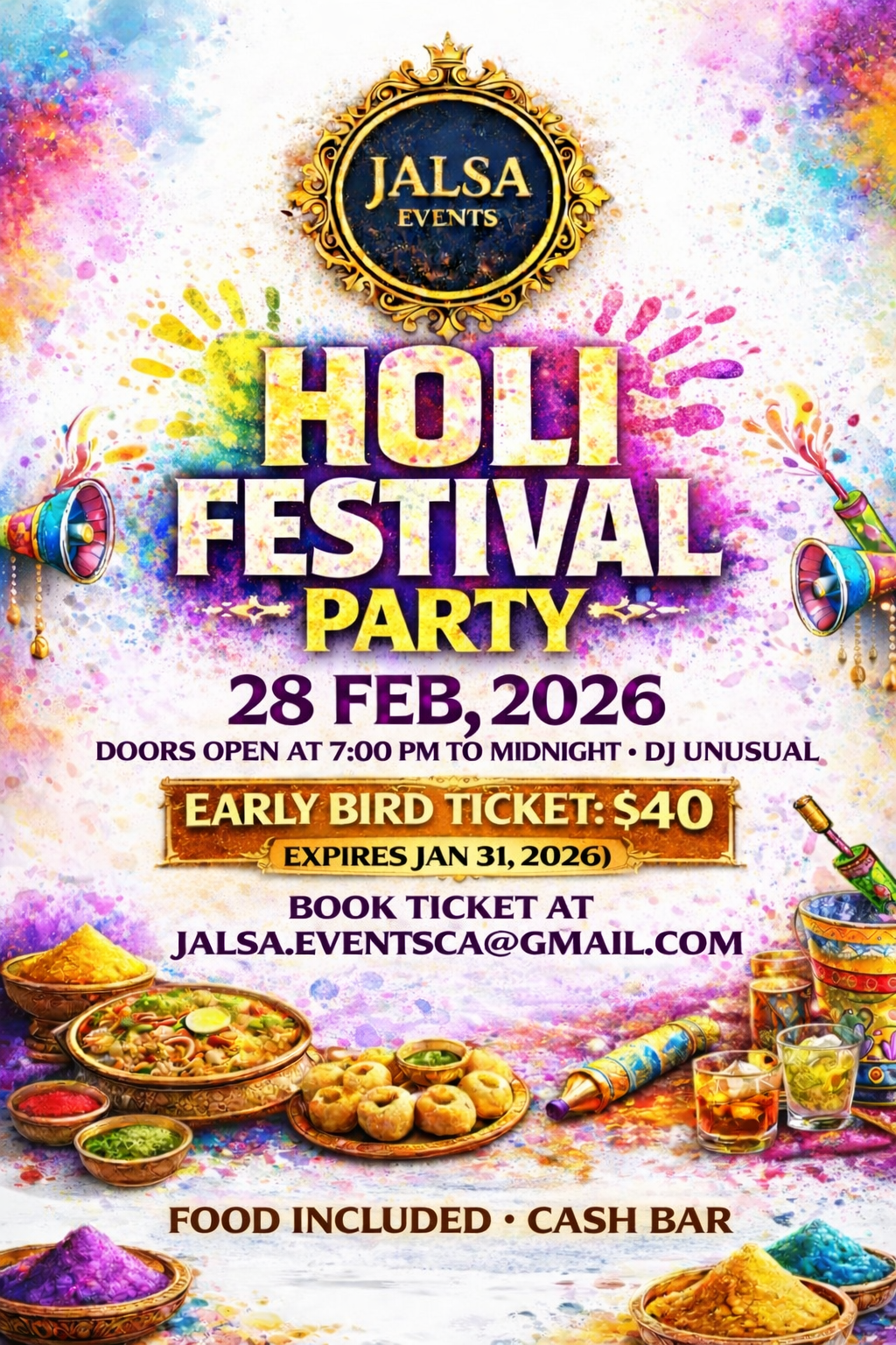 Get ready to experience Holi like never before at the Holi Festival Party 2026, presented by Jalsa Events. This high-energy evening brings together vibrant organic colors, desi club beats, and an electrifying atmosphere for one unforgettable night.