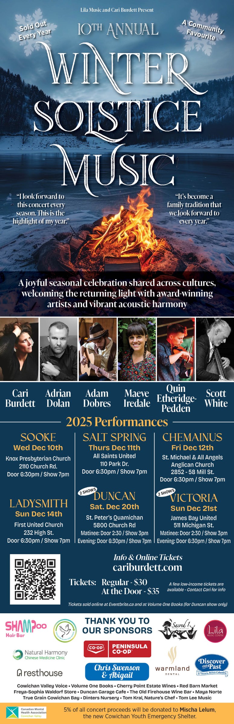 We are excited to offer 8 Winter Solstice Music Concerts this year in a tour, across Vancouver Island. Since 2010, vocalist and artistic director Cari Burdett has brought community together in celebration of the Winter Solstice — weaving song, story, and heart into an evening of stillness, reflection, and renewal. Celebrated across the world in many traditions, the Winter Solstice honors the darkest nights of the year and the gradual return of the light — a time to pause, listen, and reconnect.