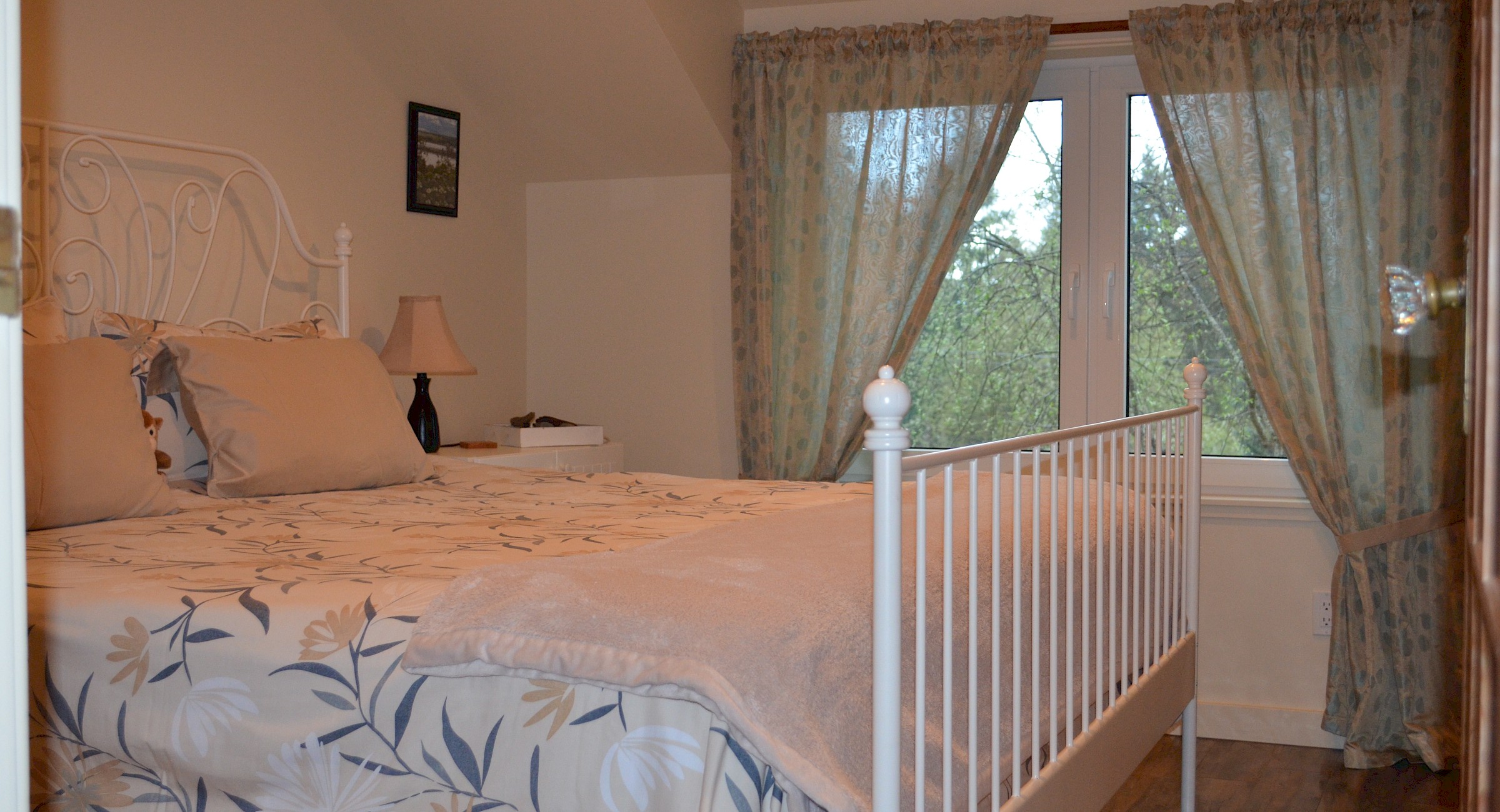 We offer our guests a second story, one bedroom suite with a breathtaking view from the kitchen and the bedroom of the Beaufort mountains, the harbour, HMCS Quadra Goose Spit, the night lights reflected on the beach, an eagle tree and an ever changing garden landscape.